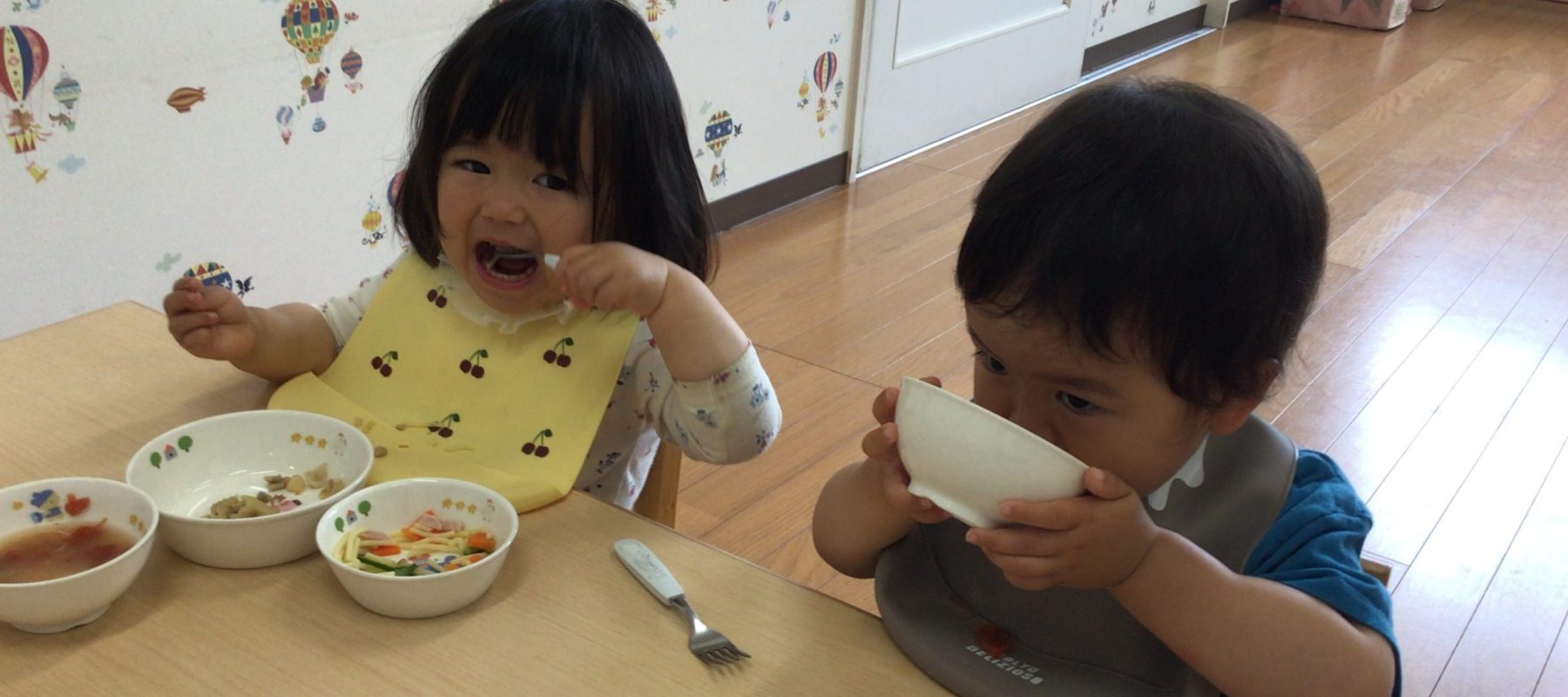 1歳児れもんぐみさんも新しい生活に少し慣れてきました。何より給食の時間が大好きです。給食が並ぶと、大きなお口をあけてモリモリ食べています。