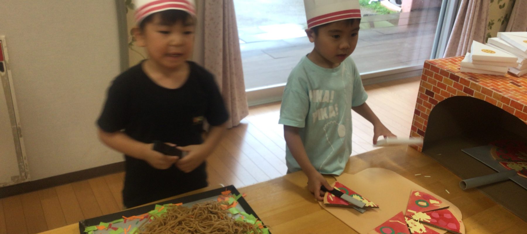 楽しみにしていたお店屋さんがありました。年長組は、レストランにゲーム屋さんと、色々な物を作って準備を進めて来ました。レストランは、ピザ、焼きそば、オムライス、アイスクリームなどメニューもたくさんでした。お客さんが買い物に来ると「いらっしゃいませー!!!」と元気に売っています。お客さんが嬉しそうに買っていくと、店員さんもほっこり笑顔になっていましたよ。