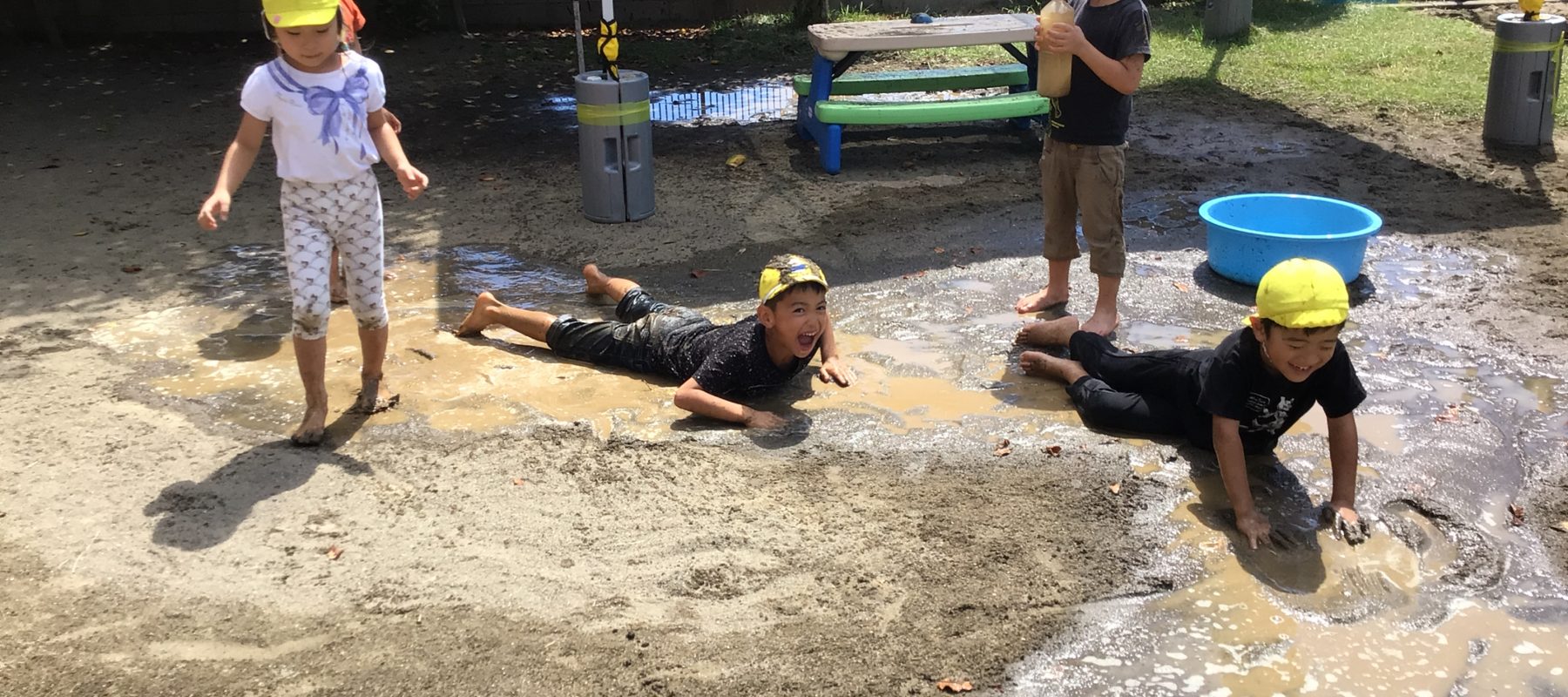 泥水をすくったり、体に塗ったりして感触をたっぷりと楽しんで遊びました。