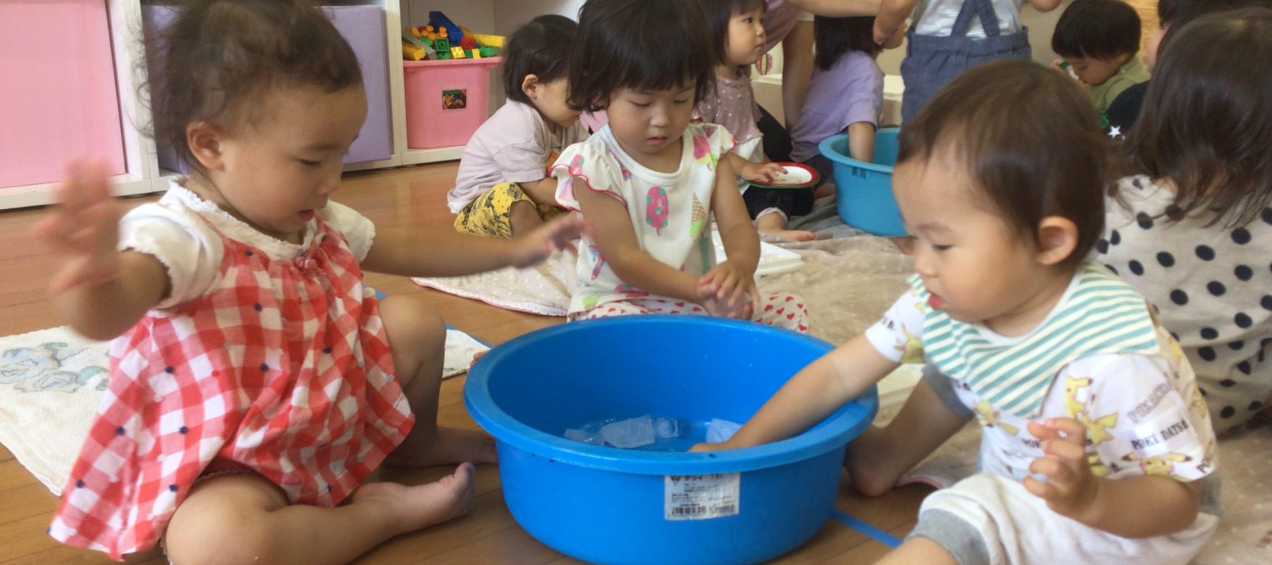 毎日、暑い日が続いています。1歳児れもん組では、初めての氷遊びを楽しみました。タライの中の氷を見て大喜び!ゆっくりと触りあまりの冷たさに驚いている子ども達でしたが、触っていくうちに「わ~!冷たいね」と言う声が出てきました。夢中になって遊びましたよ!
