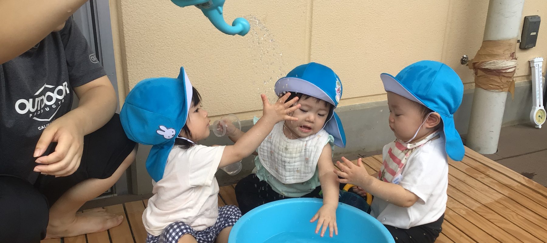 暑い日にはテラスで水遊びをしています!