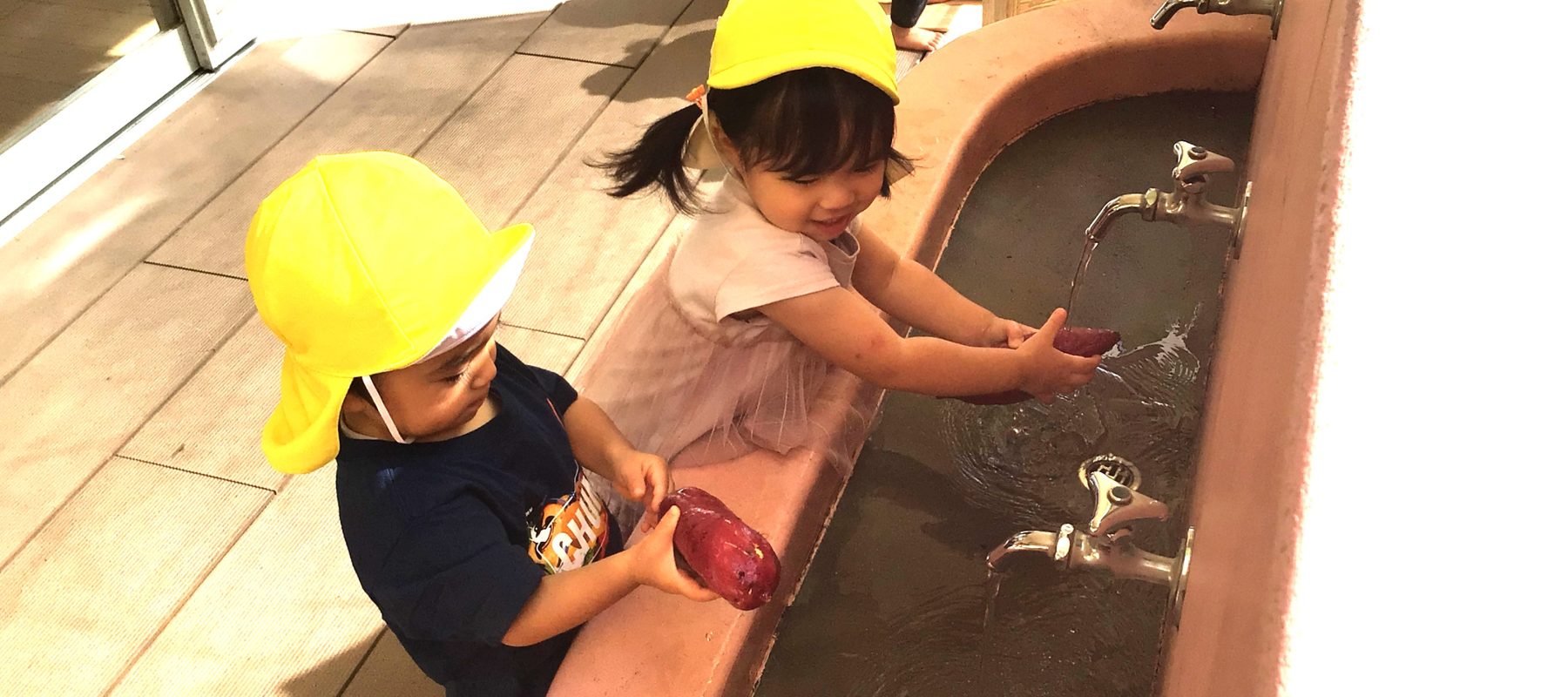 立派なさつまいもがお部屋にやってくると少し驚いたように目をまんまるにしているお友達もいましたが、お芋を洗って給食室に届けようとお話するとはりきって洗ってくれた子ども達です。保育者がおててでゴシゴシするんだよ、と伝えると真似っこをして上手にゴシゴシと洗えました。