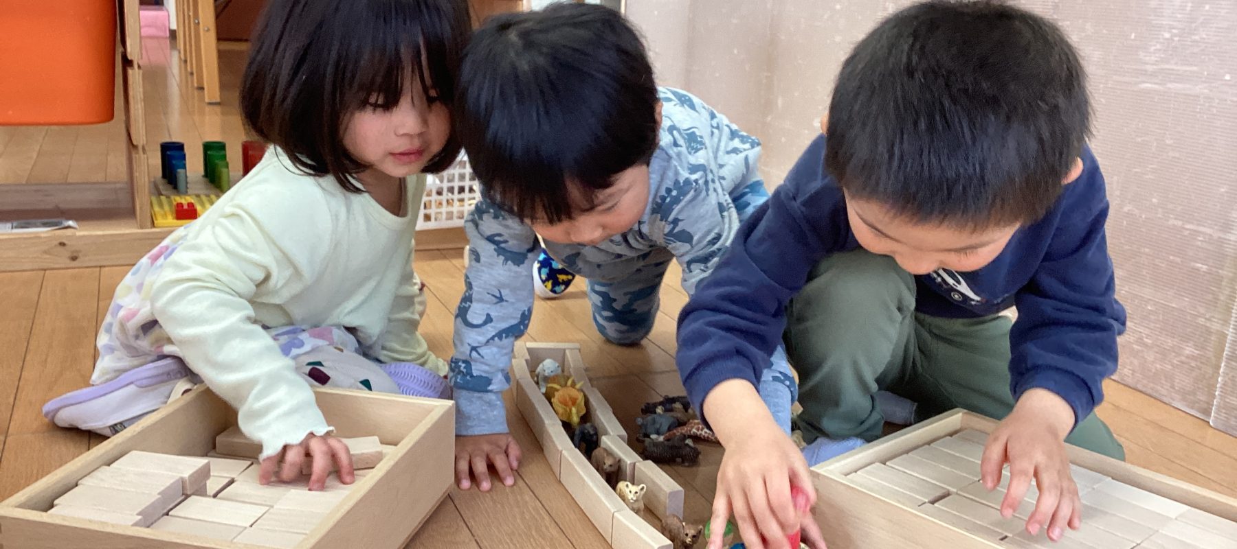 新しい積み木が保育園にやってきました。2歳クラスの様子です。積み木を並べて、お風呂屋さんを作っていましたよ。動物たちを、一列に並べながらお友達との会話を楽しんでいました。友達と遊びを共有して、作り上げる楽しさを感じています。