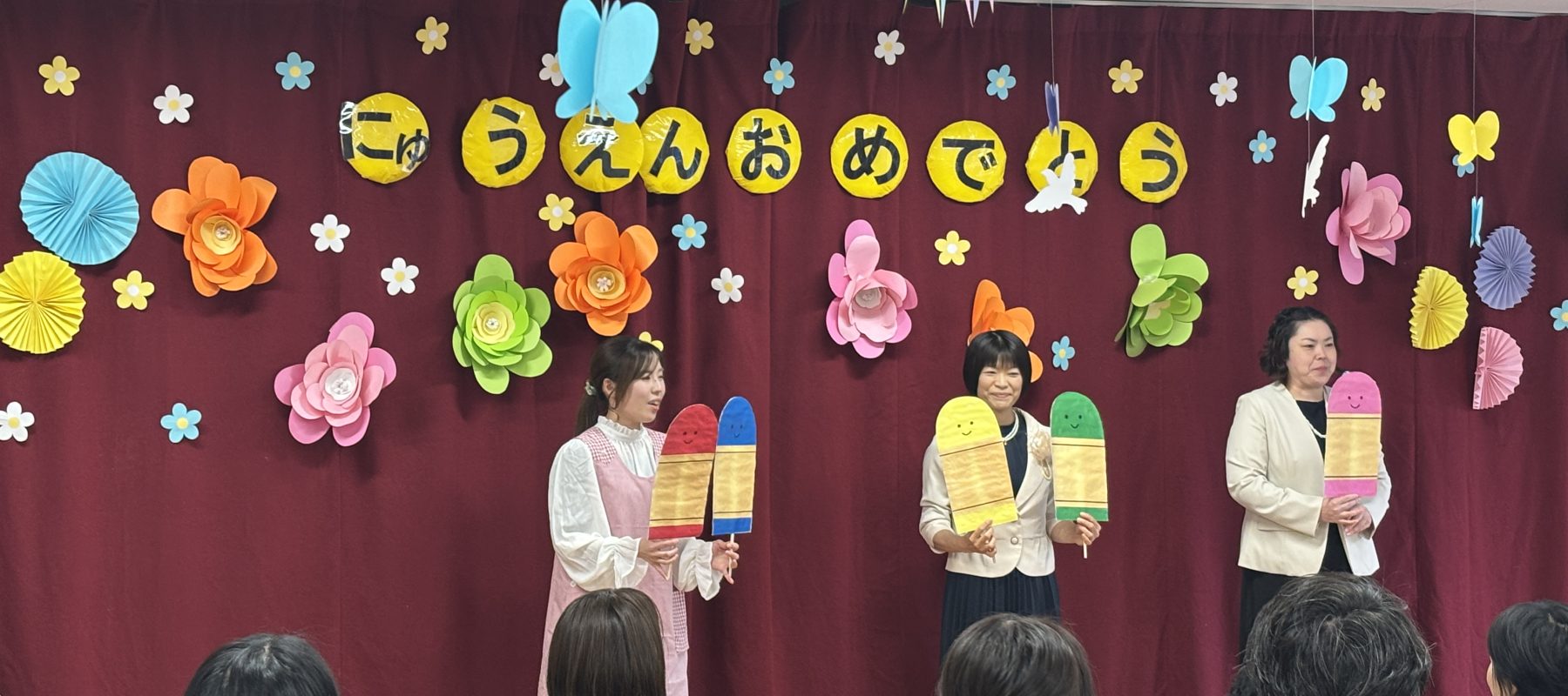 初めての保育園、新しい環境にドキドキの新入園児さん達でしたが、保育者の出し物「どんな色が好き?」のペープサートを一緒に歌ったり、手拍子をして楽しく参加してくれました。