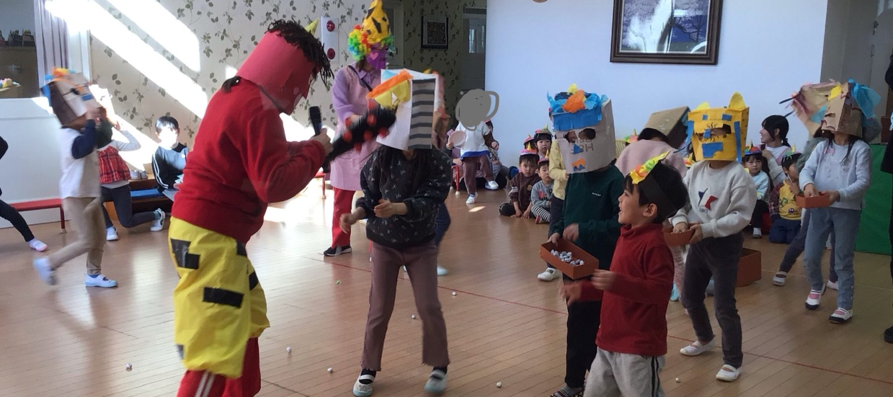 赤鬼と青鬼に豆を投げて、みんなの心の中にいる『怒りんぼ鬼』『わがまま鬼』『泣き虫鬼』を追い払いました。