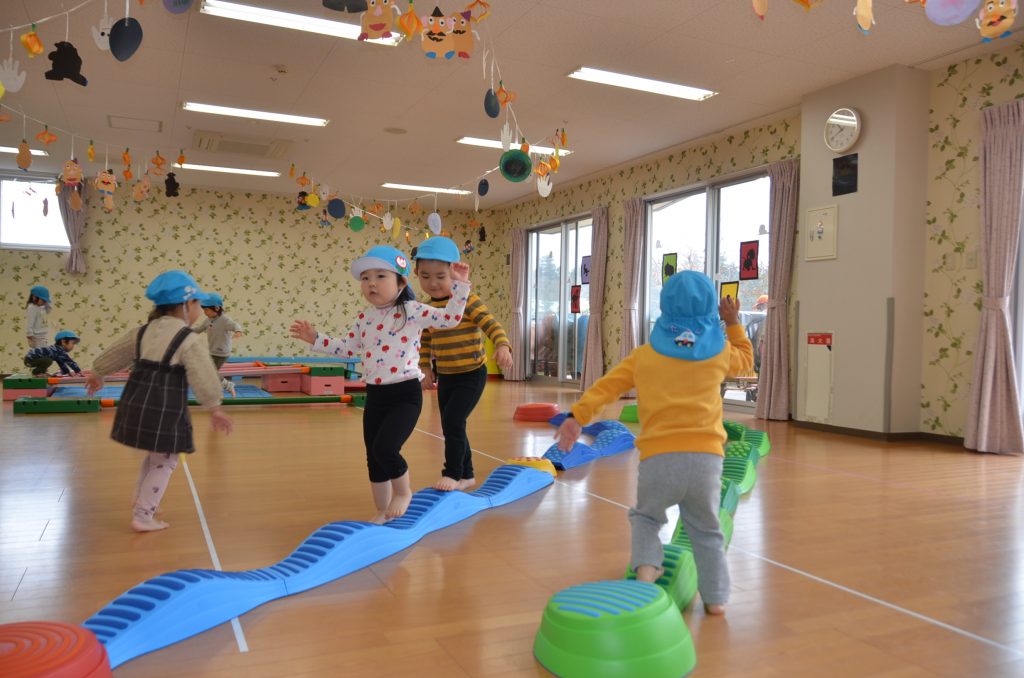 2歳児みかん組さんは、ホールで巧技台やバランス平均台をして楽しんでいます。おっとと…とバランスを崩しながらも体を上手く使って落ちないように渡れるようになってきました。少し難しい事にもチャレンジしながら、遊びできることも増えてきました。