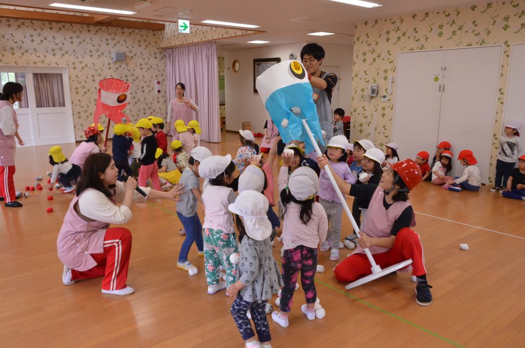 今日はこどもまつりがありました。始めに、子どもの日クイズをしました。なぜこいのぼりや兜を飾るのか、子どもの日に食べるものは何か・・・。みんな考えて元気に答えてくれました。正解すると「やったー!」と喜ぶ子もいました。それから、こいのぼり制作の発表もしてくれました。そして、お楽しみの玉入れゲーム!もも組、ぶどう組の合同チームで対決をしました。めろん組の対戦相手は、なんと先生たち!たくさん玉を投げ、とても盛り上がりました!