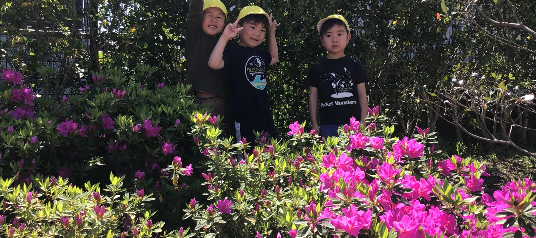 つつじが綺麗に咲いていて、その間を迷路のように走り抜け楽しんで遊んでいます。公園では、春の自然集めや広場での追いかけっこを夢中で楽しんでいます。