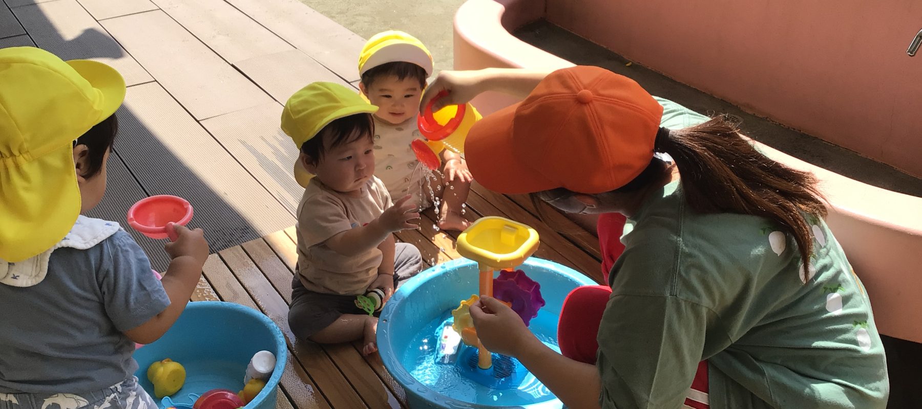 水が入っているタライを見た時は『遊んでいいの?』『どうやって遊ぶの?』と戸惑いの表情を見せていましたが、保育者に水をかけてもらうと水飛沫をあげてダイナミックに楽しむ姿が見られるようになりました。夏ならではの遊びを存分に楽しんだ子どもたちです!