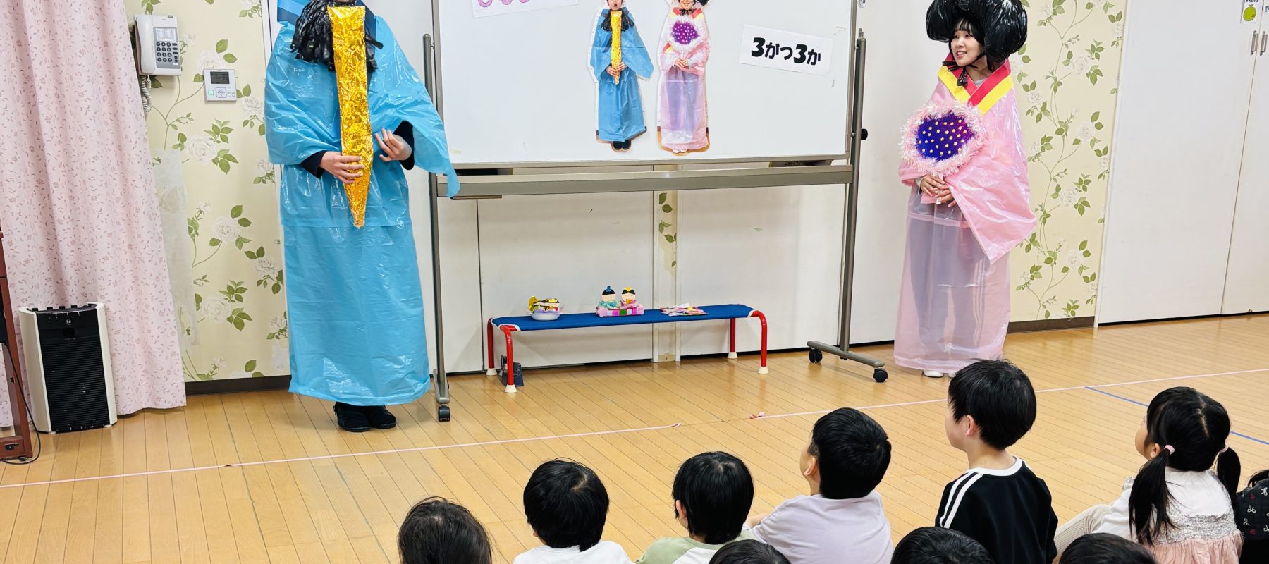 今日は、節分の会でした。自分で作った鬼のお面を被ってホールに集まって鬼のお面を紹介したり、踊ったりしました。 赤鬼と青鬼に豆を投げて、みんなの心の中にいる『怒りんぼ鬼』『わがまま鬼』『泣き虫鬼』を追い払いました。 「鬼は外~!!」と必死に投げて鬼をやっつけました。 みんなに福の神様が訪れますように・・・。