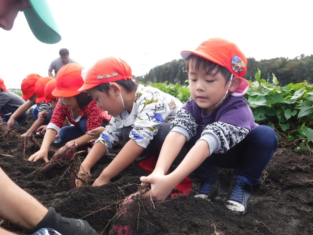 土に触れた時は「冷た~い」「気持ちわる~い」と言っていましたが、さつまいもが一つ掘れると、最初の言葉が吹き飛んでいったかのように、無我夢中で次から次へと掘っていく子ども達。子ども達同士で協力して掘る姿もあり、「こっちにもあるよ~」「誰か手伝って~」「今行くから待ってて!!」等という声も飛び交っていました。