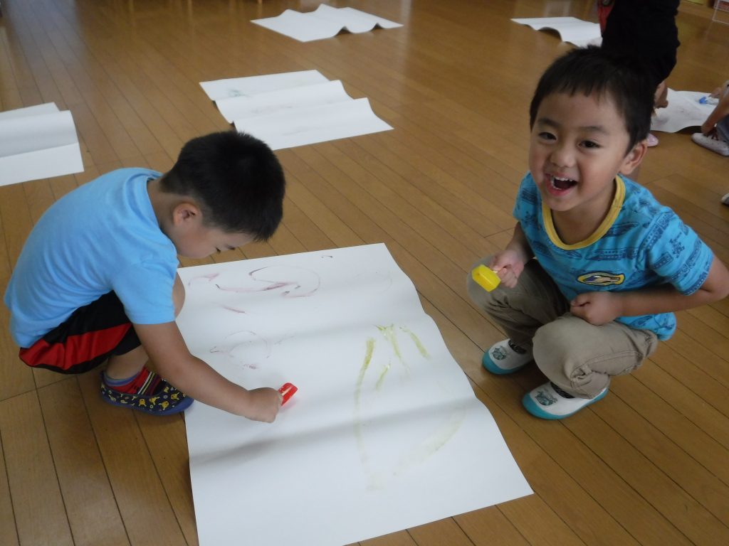 模造紙に色のついた氷を滑らせて色が付いたことに大興奮の子ども達は