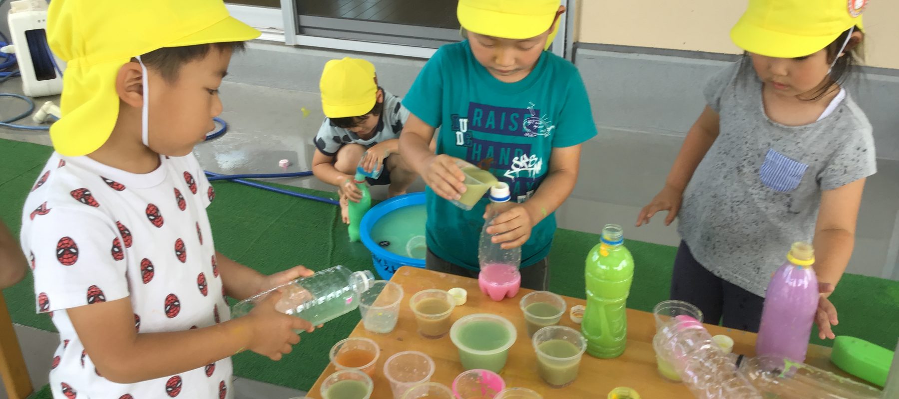 ピンク、黄色、水色などの色水が出来ると「ジュースみたーい!!」と歓声を上げながら、楽しんでいました。そして、少しずつ色を混ぜ、「ピンクと黄色でオレンジになったー!!」と色の変化や発見も楽しんだ子ども達です。